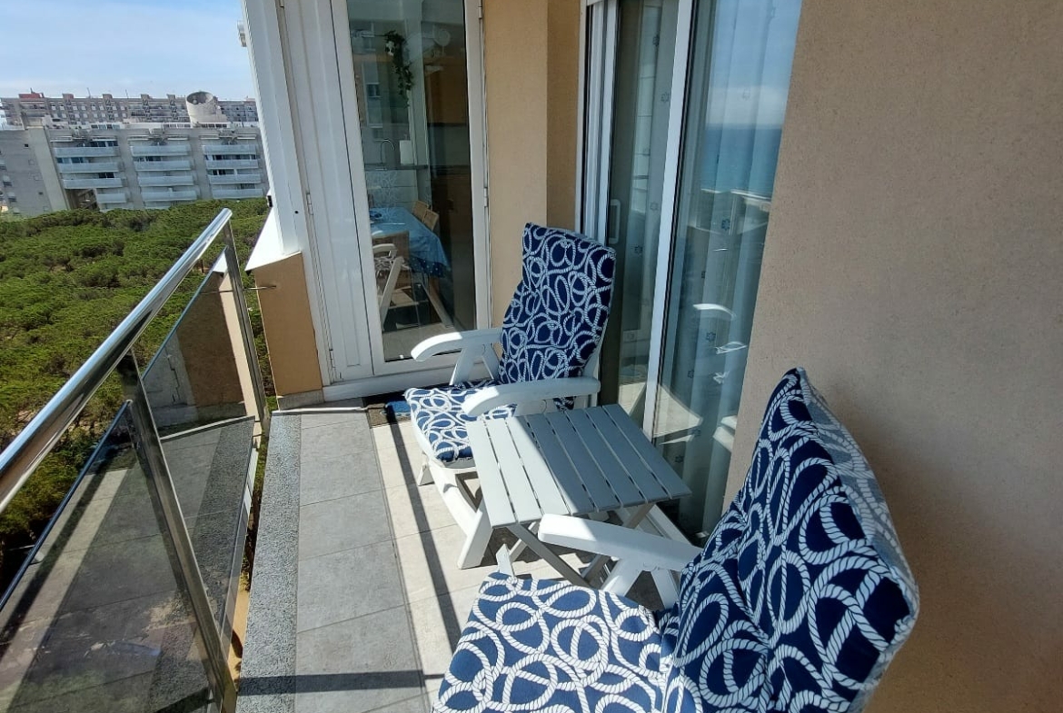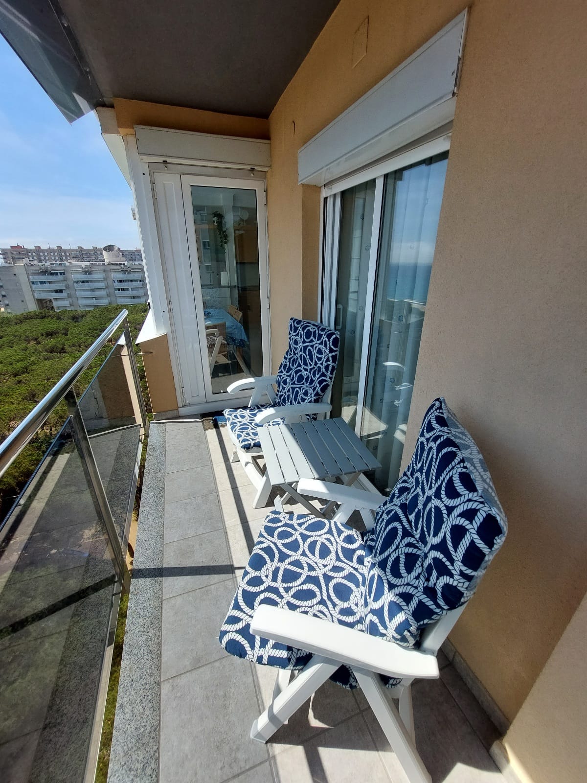 Tiene salida a un balcón con una mesa y sillas, y con vistas al mar donde es fantástico desayunar o tomarse una cerveza mirando al mar. Además desde el balcón también se ve toda la piscina y la zona comunitaria, por lo que en caso de venir con niños, se puede controlar en todo momento donde están.