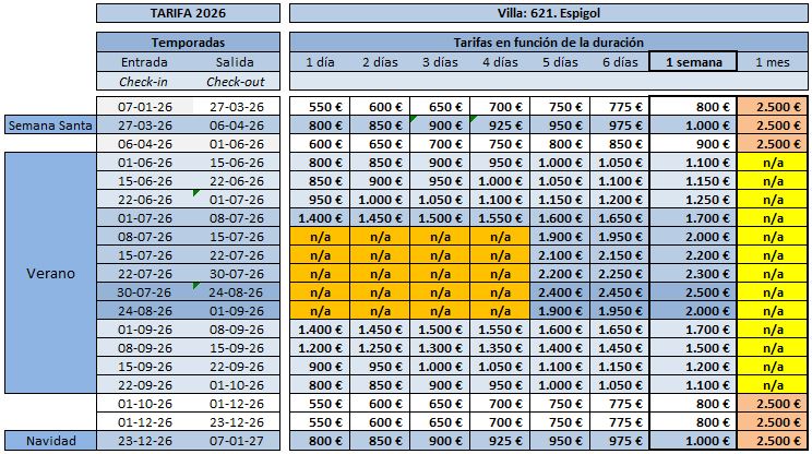 TARIFAS: (se aplica precio proporcional en caso de ocupar varias horquillas de precios)