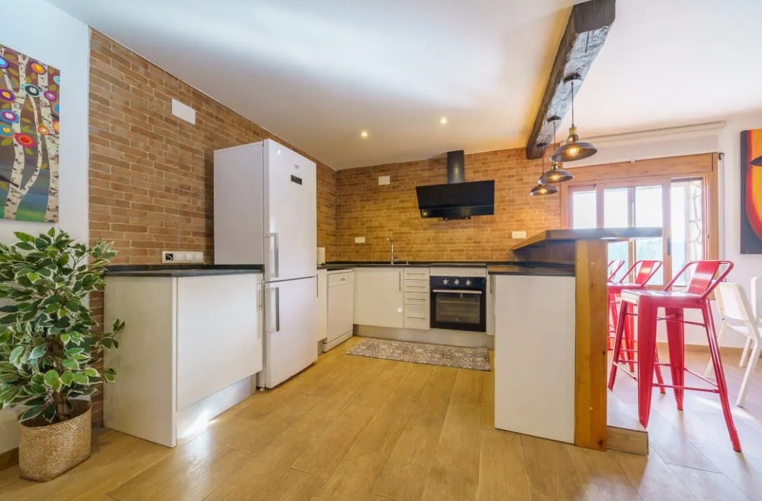 La cocina está muy bien diseñada y se caracteriza por estar abierta al salón-comedor con una gran barra americana. Está totalmente equipada con vitrocerámica, campana de diseño, horno, lavavajillas, nevera, lavadora, secadora y menaje de cocina.